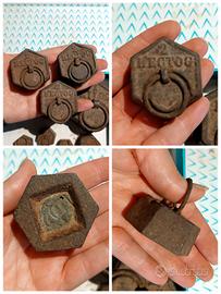Antichi pesi francesi per bilancia risalenti agli anni '50. Realizzati in metallo pieno e pesante, presentano una forma esagonale e un anello per la presa. Peso di varie dimensioni:
