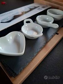 Grazioso set aperitivo Bialetti composto da 4 ciotole in ceramica di forme diverse (diametro 5 - 7 cm) e vassoietto in ardesia (cm 9 x 29 circa). Articolo nuovo in condizioni perfette, in scatola originale, mai utilizzato.