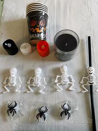 Set per un aperitivo a tema Halloween, perfetto per creare l'atmosfera giusta. Bellissimo set per aperitivo di Halloween . Comprende la tovaglia misura 180x130cm da 6/8 persone e tutta la serie di gadget in foto. Candeline led candela profumata 5 scheletri per cannuccia e ragnetti e bicchieri.