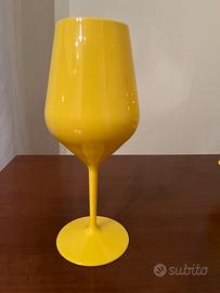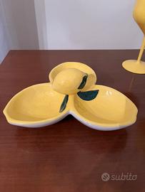 Set composto da 4 calici da vino in plastica color giallo limone e da un piatto decorativo in ceramica a forma di tre limoni con foglie.