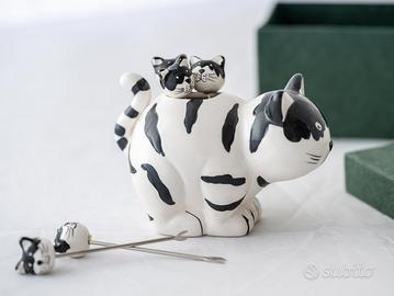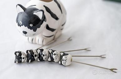 Set stuzzichini da aperitivo a forma di gatta e gattini, in ceramica.