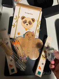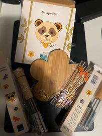 Set Aperitivo Panda completo di 2 formine. Tagliere in legno di bamboo, L 14 cm. Formine in legno e acciaio. Mai usato, ancora con protezioni.