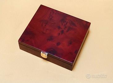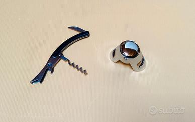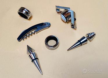 idea regalo, nuovo mai usato, oggetto perfetto con elegante cofanetto in legno scuro foderato in velluto nero. All'interno del cofanetto, diversi oggetti sono disposti ordinatamente. Accessori per il vino: un cavatappi cromo, due tappi per bottiglie di design unico, tappo ermetico cromo, due anelli antigoccia. Marca Brandani