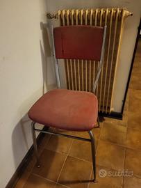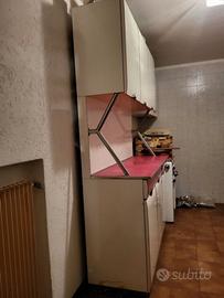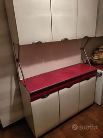 - Tavolo laminato verniciato colore rosso anni '60 con supporti in ferro. - Numero 3 sedie colore rosso anni '60 (complementari al tavolo). - Credenza a tre ante e cassetti anni '60 in metallo e laminato verniciato colore bianco e rosso.