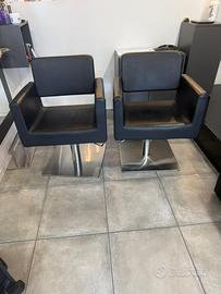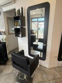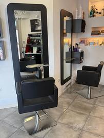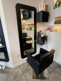 Il Tuo Pacchetto Completo Include: • 2x Postazioni Taglio/Styling Girevoli: Sedute generosamente imbottite in ecopelle nera, con braccioli coordinati, che offrono il massimo comfort al cliente durante i trattamenti più lunghi. Dotate di una robusta ed elegante base quadrata in acciaio cromato lucido, sono regolabili in altezza per un'ergonomia perfetta dello stilista. Misure 62 x 55 x 80-91 (h) • 2x Postazioni Lavaggio Complete (Unità Retro-lavaggio): Due postazioni ergonomiche e confortevoli, perfettamente integrate con lavandini in ceramica bianca dotati di miscelatore e doccetta. Il design offre un'ampia area di lavaggio e un comfort superiore per il cliente. Misure : Larghezza 63cm profondità 100cm • 2x Poggiapiedi in Acciaio Cromato: Poggiapiedi autoportanti dal design minimalista, realizzati in solido acciaio cromato lucido. Forniscono un supporto essenziale e una postura confortevole per il cliente durante tutte le fasi del servizio. • 2x Specchi a Figura Intera con Cornice Coordinata: Eleganti specchi con una moderna cornice nera opaca a angoli smussati. Includono una mensolina integrata (metallo/vetro) per appoggiare comodamente strumenti, spazzole o il caffè del cliente. L 75cm x H 210cm (185 solo specchio) x P 16 cm Vendita in blocco 2800€ Trattabili Telefono 3476691442