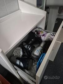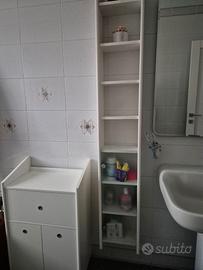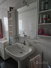 Set completo arredo bagno laccato bianco con due vetrinette ad anta sulle due colonnine di 180 cm e 80 cm larghezza 30 cm profondità 16 cm. Un mobiletto 87×54×33 cm con ampio cassetto e due antine. Specchio comprensivo di faretto 90×75 cm. Porta asciugami cromato più bicchiere porta apazzolino e porta sapone.