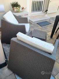 Set di arredo per esterni, ideale per giardino o terrazzo. Il set include 2 sedute ed un tavolino. - Struttura in rattan sintetico color tortora. - 4 Cuscini sfoderabili color panna. - Tavolino 49x49xh 33 cm Poltrona: 75x75xh 70 cm