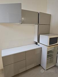Vendo set d'arredo dal design minimal e contemporaneo, perfetto per uffici, monolocali o zone break. Finitura lucida color tortora/fango con top bianco, elegante e molto facile da pulire. Il tutto è in ottime condizioni.