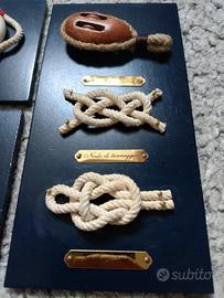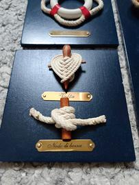 Vendo set di decorazioni a tema mare, tutte realizzate su basi in legno blu scuro. Oggetti da appoggio molto curati, ideali per mensole, scrivanie o collezionismo.