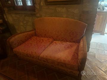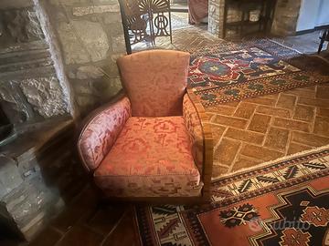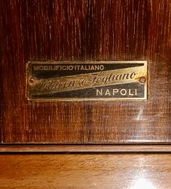 Vendo rarissimo e prestigioso set completo da salotto originale degli anni '30/'40, di altissima ebanisteria italiana. Il set è firmato con etichetta originale del Mobilificio Napoli - Vincenzo Fogliano, storica eccellenza del design e della manifattura campana del XX secolo. Il set è composto da 7 elementi coordinati: • 1 Divano a due posti con schienale sagomato. • 4 Poltrone "club" con fianchi in magnifica radica di noce a fiamma. • 2 Pouf / Sgabelli coordinati. Caratteristiche e Pregi: • Materiali: Struttura in legno massiccio rivestita in pregiata radica di noce bionda, caratterizzata da una venatura a specchio di eccezionale resa estetica. • Design: Tipico stile Art Déco con linee curve e avvolgenti, braccioli scultorei in legno a vista. • Stato di conservazione: Il legno è in ottime condizioni originali, con una bellissima patina d'epoca. Il tessuto jacquard presenta i segni del tempo ma è integro (perfetto per un restauro conservativo o una foderatura moderna in velluto). • Autenticità: Ogni pezzo riporta l'etichetta originale che ne certifica l'attribuzione a Vincenzo Fogliano. Si tratta di un'opportunità unica per collezionisti di modernariato o per chi desidera arredare un salone di rappresentanza con pezzi di design storico italiano. I set così completi (7 pezzi) sono estremamente rari sul mercato. Ritiro a carico dell'acquirente.