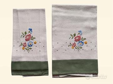 3 Completi asciugamani viso e bidet in lino con fiori ricamati a mano sul bordo. Fondo bianco con bordo verde e fiori colorati. Fondo rosa con bordo bianco e fiori colorati. Fondo bianco con bordo rosa e margherite bianche. Misure viso 97 x 59 cm. - bidet 41 x 59 cm. Anni ’70. Nuovi. Made in Italy