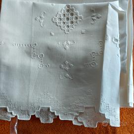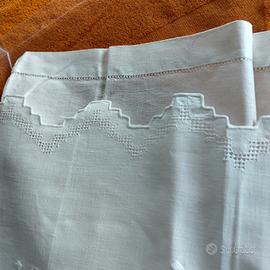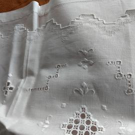 elegante set da bagno in misto lino di colore bianco. ricamati a mano e finiti a orlo a giorno composti da un ospite 57x32 cm e viso 110x70 cm