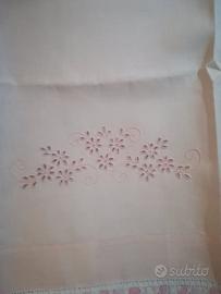 Interamente ricamato a mano, punto inglese, orli rifiniti a punto a giorno.