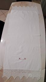 Due hanno bellissimo pizzo realizzato all'uncinetto e cifre a punto croce, e l'altro ha griglia a fili tirati e dei punti ripresi lateralmente. La maestria dell'epoca traspare anche dalla manifattura del rammendo: vedi ultima foto.