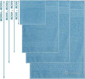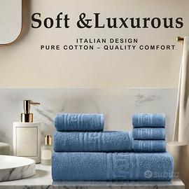 Set Asciugamano Bianco NUOVI SIGILLATI. MAI APERTI 100% Cotone Set di Asciugamani per Bagno-Morbidi ed Altamente Assorbenti Made in Italia-Blu Vendo a mano a Roma o spedisco SET DI 6 ASCIUGAMANI: Include 1 Pezzi asciugamani da bagno (100 x 150 cm) ,1 Pezzi asciugamani (60 x 100 cm) e 1 Pezzi asciugamani (40 x 60 cm) 3 Pezzi Lavette (30 x 30 cm) per un completo set di asciugamani per tutte le tue esigenze. ULTRA ASSORBENTE: Realizzati con alta densità di cotone, questi asciugamani sono altamente assorbenti e si asciugano rapidamente, mantenendo la pelle delicata e morbida eliminando efficacemente l'umidità. 100% COTONE DI ALTA QUALITÀ: L'uso del 100% di cotone garantisce un tocco di estrema morbidezza e resistenza nel tempo, mentre la superficie liscia evita la dispersione delle fibre. Prodotto in Italia: Le nostre asciugamani runico sono realizzate completamente in Italia, dall'intreccio dei filati di cotone alla tintura, al taglio e alla confezione.Il tessuto è sicuro sulla pelle, certificato OEKO-TEX e non OGM. Noi di Nice homeit ci impegniamo a garantire la completa soddisfazione dei nostri clienti. Il tuo comfort è la nostra priorità e siamo pronti a fare tutto il possibile per soddisfare le tue esigenze