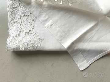 Vendo set di asciugamani vintage con pregiato ricamo a intaglio e punto sodo realizzato a mano e orlo in punto a giorno. Tessuto di puro cotone colore bianco. Il set è compost da 1 asciugamani viso 115x65 centimetri e 1 asciugamani ospiti - bidet 60x35 centimetri. Nuovi, mai usati, vendo per inutilizzo.