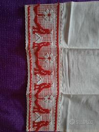 ASCIUGHINO PER LA CUCINA, CON APPLICAZIONE IN COTONE (cm. 70X45), in ricamo e tessuto tipico sardo ( vedi etichetta in foto) + set coppia presine tipiche sarde morbide ( cm 18x18 ); tutto nuovo.
