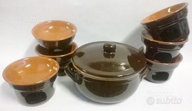 Set bagna cauda in terracotta completo di n.1 tegame con coperchio 24 cm e n.12 fornelli bagna cauda,candeline e retina spargifiamma, made in italy.