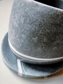 Serie Yvonne di Gedy, finitura grigio opaco, realizzati in resina, presentano qualche macchia come da foto, ma sono robusti e resistenti. Dimensioni bicchiere: L. 9.3 x P. 9.6 x H. 9 cm. Dimensioni piattino: L 11,8 x 11,7 x H 2,3 cm. Vendo per cambio arredo.