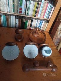 Set da bagno vintage anni 80 in legno completo di tutti gli accessori, mai usato, le ceramiche presentano delle fratture ai bordi il sistema di attacco è da rivalutare.
