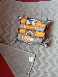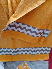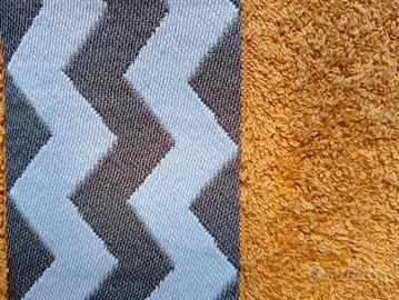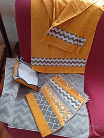 set bagno da 8 pezzi della linea Bitossi Home linea Baroque composto da : 1 tappeto scendi bagno grigio Zig Zag 1 asciugamano Zig Zag senape 1 asciugamano ospite Zig Zag senape 1 cestello per lavette 4 lavette spedizione rapida.nuove con cartellino.