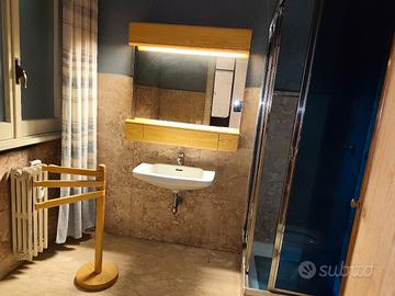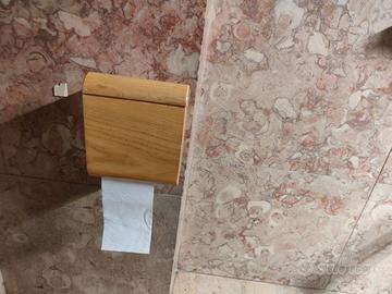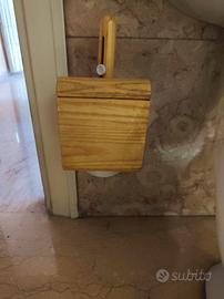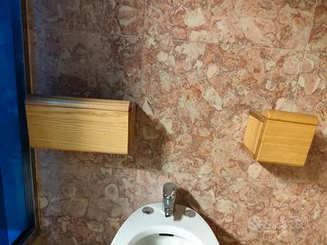 Vendo set bagno coordinato in legno chiaro/color miele, composto da specchiera con illuminazione integrata, mensola/portaoggetti e accessori abbinati da parete. Stile classico anni ’80-’90, ideale per bagno, seconda casa o ambiente dal gusto rétro. Usato, in condizioni generali buone, con normali segni del tempo. Molto interessante per chi cerca un insieme completo e coordinato, non i singoli pezzi spaiati. Preferibile ritiro a mano. Dimensioni: 94x96 cm