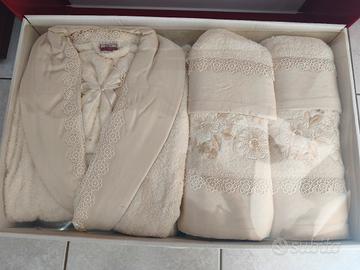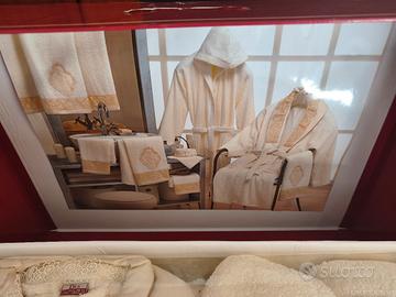 set bagno dea battaglia composto da: accappatoio donna con decori accappatoio uomo 2 asciugamani viso 2 asciugamani ospiti 1 fascetta 1 manopola tutto nuovo mai usato, tranne un asciugamano ospite che è stato usato per asciugare la testa del bambino al battesimo, poi è stato lavato e ricollocato al suo posto. modello royal con decori in pizzo spugna morbida e di ottima qualità presente il certificato di garanzia e valigia originale valore di mercato tra i 240€ ai 420€. prezzo affare valuto offerte