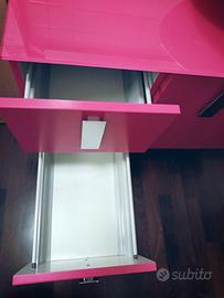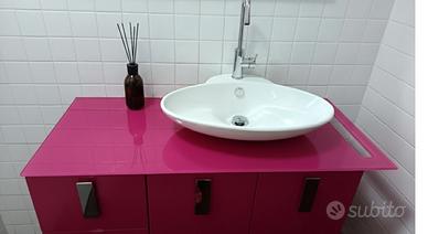 finitura laccata color Magenta dotato di cassetti e ante con maniglie cromate. Top in vetro con lavabo e ciotola in ceramica bianca.