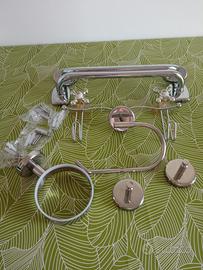 Tutto nuovo, con i propri tasselli, acciaio inox, set completo bagno, portasciugamano, porta rotolo ganci, sostegno phone, tutto 30 euro, o 5 euro cad.