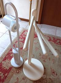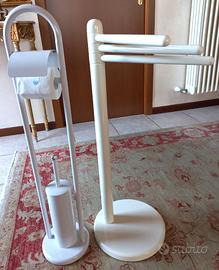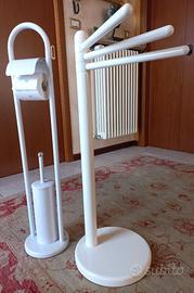 Set bagno composto da 2 piantane coordinate in metallo e legno verniciate di bianco. Il set include: 👉 Piantana porta-rotolo con supporto porta spazzolino in metallo, compatta e pratica. 👉 Piantana porta asciugamani in legno, con 3 appendini. Struttura verniciata bianco, dal design semplice e pulito, facilmente abbinabile a diversi stili di arredo bagno. Soluzione funzionale e salvaspazio, perfetta sia per bagno principale che per bagno di servizio. Venduti in coppia (set completo). 👉 ATTENZIONE ALLA SPEDIZIONE: Non scegliete Poste perché é fuori misura (il pacco è troppo lungo). Consiglio di scegliere UPS. CONDIZIONI: visto e piaciuto come in foto.
