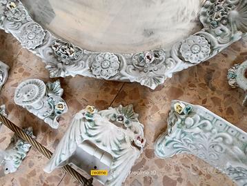 Set bagno vintage, in ceramica, composto da tanti pezzi (specchio, lampadario, mensola, porta asciugamani....).Un braccio del lampadario rotto. Si trova abbastanza in buone condizioni, ci sono da pulire e qualche pezzo da restaurare.