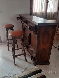 Vendo come da foto n.2 sgabelli e bancone da bar in vero legno marrone, robusto, rustico, solido e ben tenuto. Bancone con mensole sul retro ideali per qualsiasi porta oggetto. Altezza sgabelli 80 cm, larghezza bancone 155 cm e profondità circa 50 cm