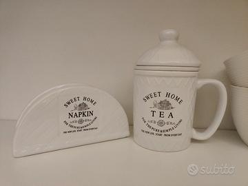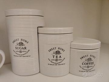 vendo set completo di barattoli e tazze per cucina, in ceramica bianca con scritta Sweet Home.