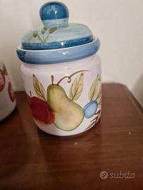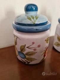 Set tre barattoli in ceramica per sale, zucchero, caffè, lavorazione artigianale, dipinti a mano, nuovi, altezza 12 cm. (senza coperchio), larghezza 10 cm.