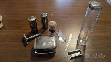 Condizioni: L'oggetto è un pezzo autentico del passato. Presenta una naturale patina del tempo che ne attesta l'originalità. I componenti in vetro sono integri e il rasoio non presenta difetti strutturali.
