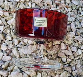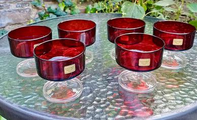 Set di sei ciotole per bicchieri da dessert/champagne Luminarc, bicchieri rossi vintage. In vetro Cavalier Ruby Red sono state realizzate da Luminarc in Francia negli anni '70, disegnate da JC Durand. Hanno un colore adorabile e una dimensione tattile con i loro pesanti steli in vetro trasparente. Questo elenco è per un set di 6, ma ho anche 2 set di 4 elencati separatamente.