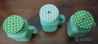 Vendo Set di tre bicchieri in vetro Mason Jar, in ottimo stato decorati e provvisti di coperchio in metallo con foro per cannuccia .
