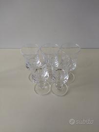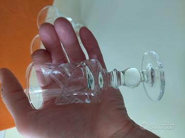 Set composto da 5 bicchierini da liquore vintage in vetro trasparente inciso a mano con decoro geometrico.