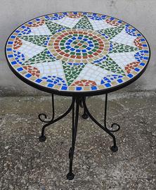 Il tavolo ha un piano circolare decorato con mosaici colorati e una base in metallo nero con dettagli a ricciolo.