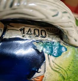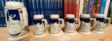 Set di 12 boccali da birra, 2 grandi e 10 medi, con figure in rilievo colorate e numerate, realizzati in Germania nel 1980, raffiguranti personaggi e paesaggi del Tirolo. Uno dei boccali medi, come mostrato in foto, presenta una piccola scheggiatura sul bordo superiore.