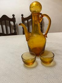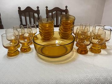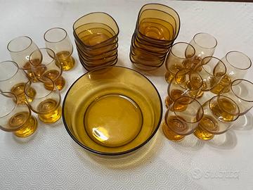 Ser vetro giallo- Bormioli 14 bicchieri con altezza 12 cm 13 ciotoline per macedonia 2 porta uova 1 acetiera 1 zuppiera 1 formaggiera con struttura base e coperchio in legno