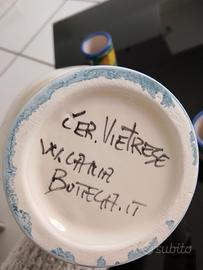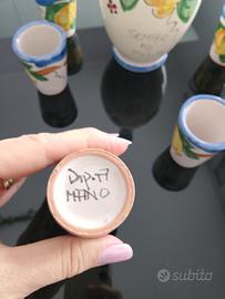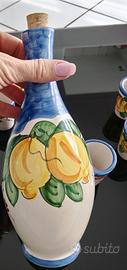 Set composto da una bottiglia e sei bicchierini per limoncello fatti a mano. Ceramica vietrese.