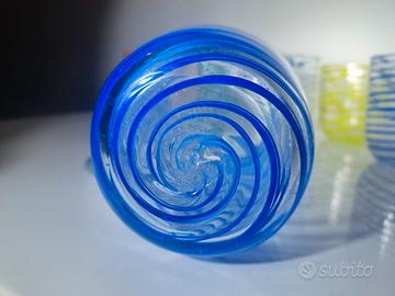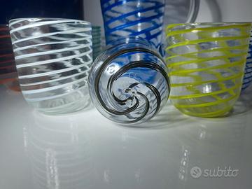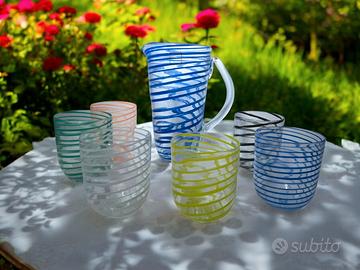 La caraffa e i bicchieri sono caratterizzati da un'elegante spirale colorata che avvolge il vetro trasparente, creando un gioco di luci e colori di grande effetto.