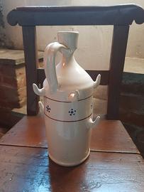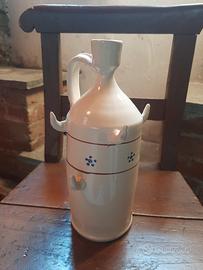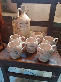 Set brocca e sei tazze Articolo caratteristico del Sud Italia nuovo mai utilizzato, ceramica smaltata panna con decorazione a fiorellini blu Misure della brocca bottiglia, altezza 27 cm diametro alla base 10 cm, diametro del collo 3.5 cm Misure di ognuna delle sei tazze: altezza 9 cm diametro alla base 6 cm e diametro superiore a 7 cm Particolare conformazione per cui si possono appendere le tazze alla bottiglia come visibile in foto Ottima idea regalo natale o compleanno