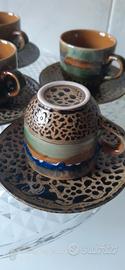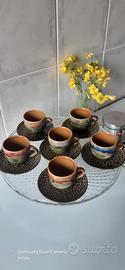 Set di 6 tazze e piattini da caffè in ceramica a smalto in stile "animalier", con tecnica di colori a steati sovrapposti ispirati alla natura.