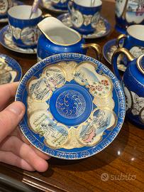 Vendo raffinato servizio da caffè/tè giapponese vintage, produzione Made in Japan, dipinto a mano con decorazioni blu cobalto e rifiniture in oro.