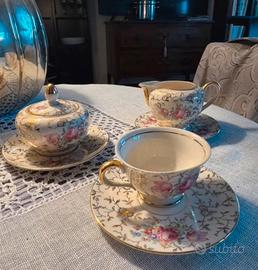 Vendesi raffinato set da servizio in pregiata porcellana tedesca Kerafina Bavaria, caratterizzato da un delicato motivo floreale (rose) e rifiniture in oro zecchino sui bordi e sui manici.