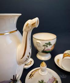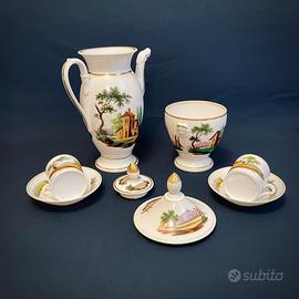 Servizio da caffè in stile impero porcelaine de Paris “Vecchia Parigi” Giustiniani del 1820/1830. realizzato in porcellana bianca, decorata a mano con decorazione policroma con raffigurazioni bucoliche e dettagli in oro. il set comprende: - caffettiera grande - zuccheriera grande - 2 tazzine con piattino Dimensioni: -Caffettiera: altezza totale 25cm - Zuccheriera: altezza totale 20cm - Tazzina: altezza 6cm - Piattino: diametro 12cm Ottime condizioni, solo la zuccheriera presenta una filatura visibile solo all'interno (vedi foto) Le foto sono parte integrante della descrizione #Ginori #Fornasetti #Alessi #Accolay #Seletti #JacquesBlin #Polspotten #Thesocialitefamily_ #Christofle #rogercapron #Zarahome #HMhome #jacquespouchain #robertpicault #bitossi #Memphis #Cloutier #Sottsass #lalique #moretti #vitra #daum #gioponti #starck #Trudon #Vallauris #vintage #brocante #retro #vintage #deco #decoration #ideedeco #ideecadeau #artsdelatable #antique #ancien #patine x #patina #shabbychic #wabisabi #japandi #scandinavianstyle #hygge #interior #interiordesign #interiordecoration #interieur #decorationinterieur #polspotten #hay #collection #porcelaine #limoges #faience #verre #murano #design #midcenturymodern #antiquemarket #fleamarket #artdeco #artnouveau #modernisme #brutalisme #décoindustrielle #annees50 #annees60 #annees70 #50s #60s #70s #faitmain #ceramics #studioceramics #studiopottery #pottery #terracotta #terrecuite #marbre #onyx #travertin #Zara #meissen #meissenporcelain #zsolnay #zsolnaypecs #herend #herendporcelain #richardginori #royalalbert #villeroyboch #botanica #royalcopenhagen #royalcopenhagencollection #rosenthal #porzellan #porzellangeschirr #porzellanteller #candela #candelaprofumata #yankeecandle #floradanica #royalcopenhagencollection #royalcopenhagenchristmas #royalcopenhagenfigur #statuine #statuinedacollezione #denmark