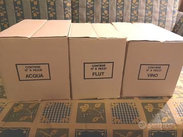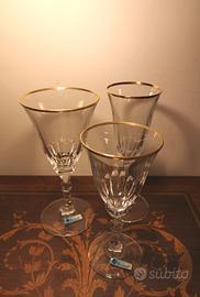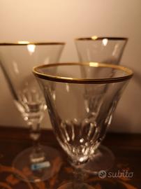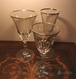 Vendo splendido set composto da 18 calici in cristallo, acqua, vino e flute, impreziositi da un elegante bordo dorato.