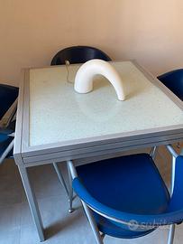 Vendo elegante set da pranzo completo originale Calligaris, un'icona del design Made in Italy anni '90, in ottime condizioni generali. IL TAVOLO: Modello: Quadrato allungabile con struttura in metallo satinato. Piano: Cristallo temperato trasparente con superficie superiore liscia. La caratteristica "puntinatura" serigrafata si trova sul lato inferiore, donando profondità e facilitando la pulizia. Misure: [90x90 cm chiuso / 180x90 cm aperto]. Meccanismo: Apertura scorrevole fluida e perfettamente funzionante. LE SEDIE (4 PEZZI): Modello: "Atomic" di Calligaris. Materiali: Struttura ergonomica in alluminio satinato e rivestimento in vera pelle blu. Stato: Pelle ben conservata, sedute comode e avvolgenti. Tutte le sedie riportano l'etichetta originale di autenticità Calligaris (vedi foto). Set ideale per chi cerca mobili di qualità superiore, robusti e dal design senza tempo. Disponibile per visione. Ritiro a carico dell'acquirente a Terni